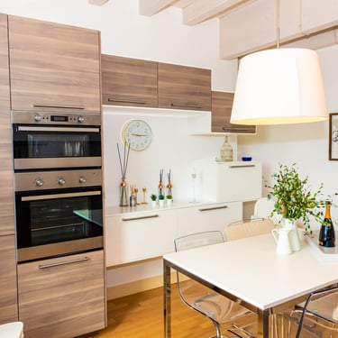 Cucina abitabile completamente attrezzata con elettrodomestici e utensili, con accesso diretto al terrazzino privato
