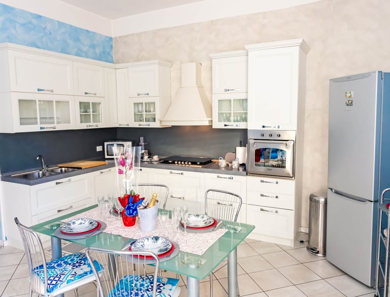 Bilocale al primo piano con ingresso indipendente, cucina super attrezzata, soggiorno con divano letto, camera matrimoniale con cabina armadio e sottotetto sfruttabile con due posti letto aggiuntivi.